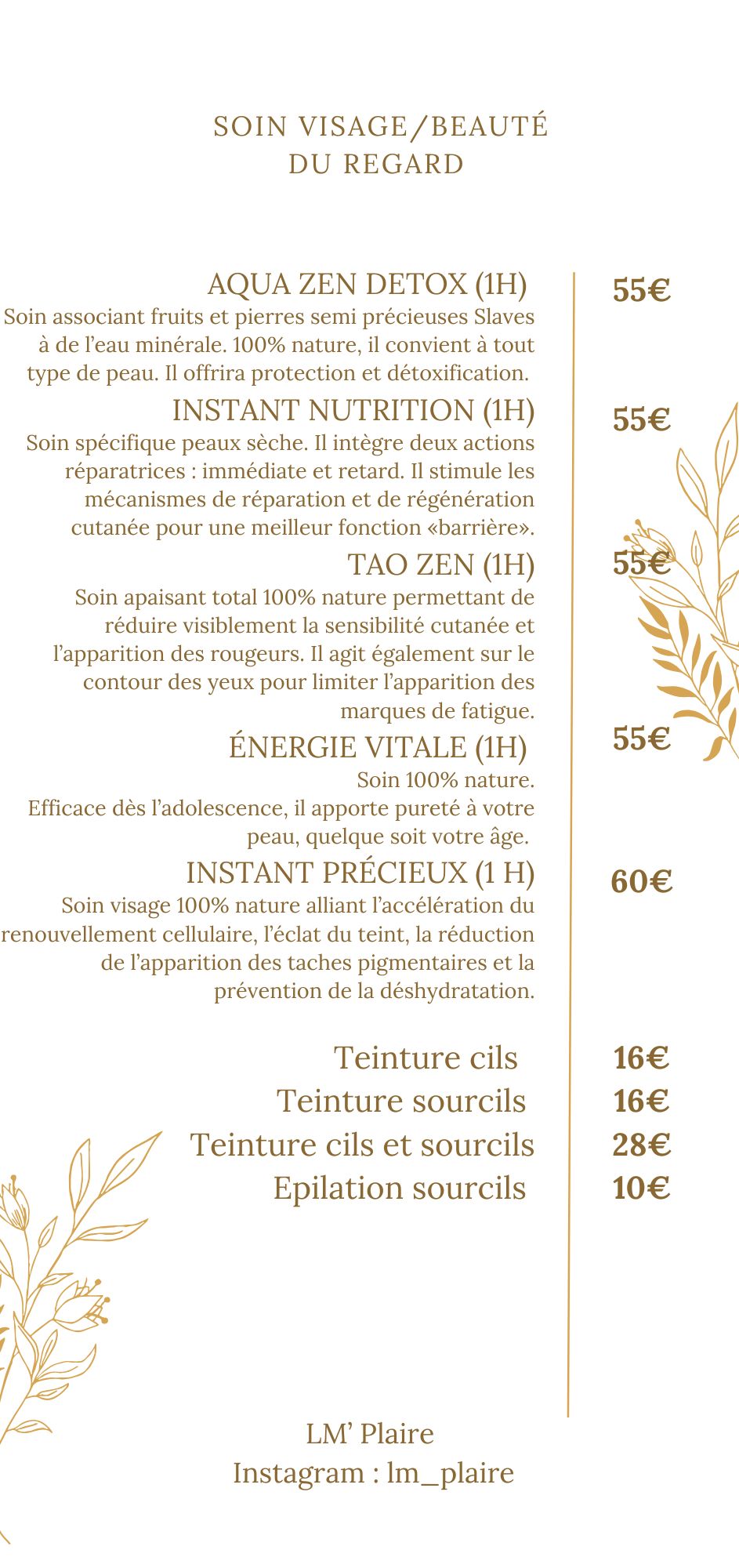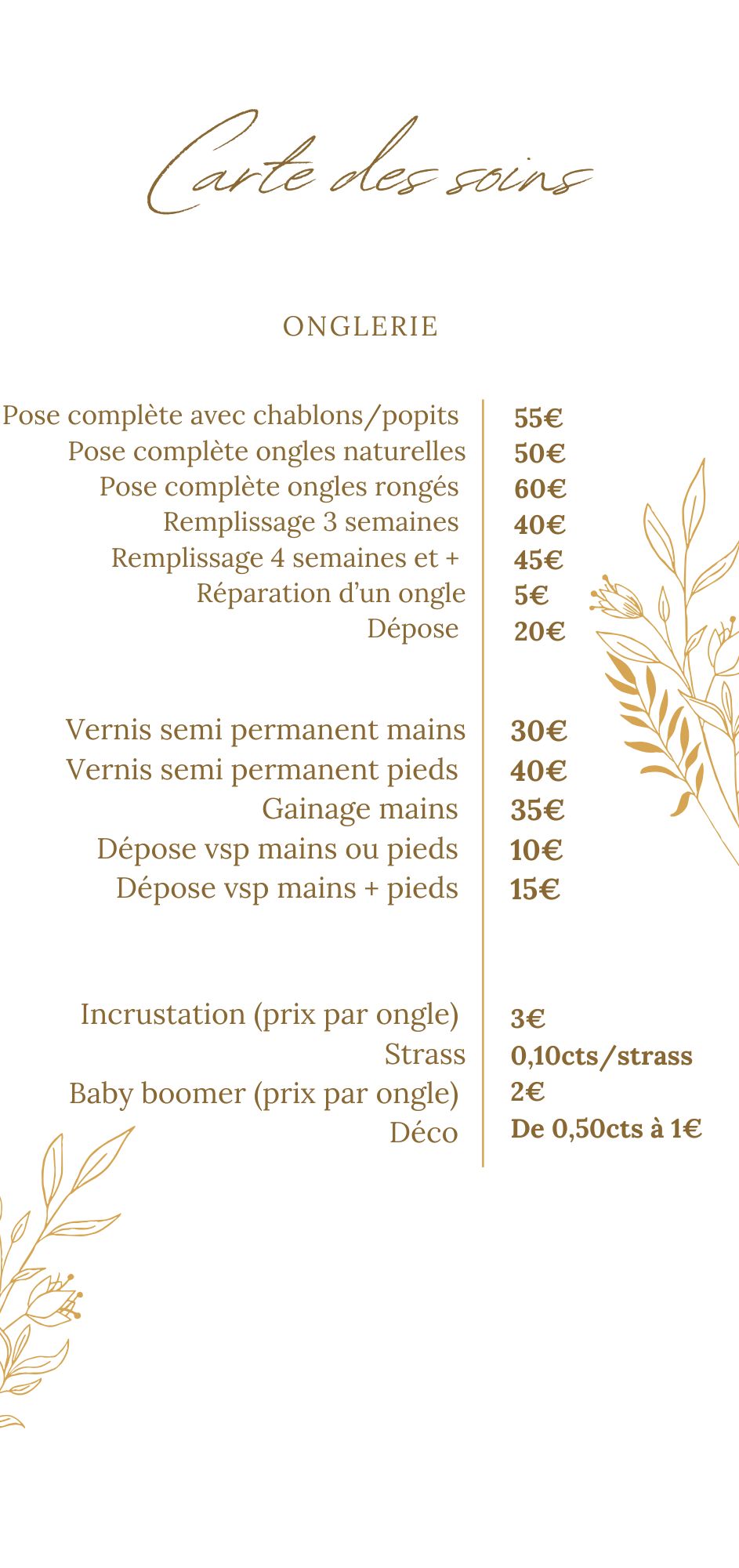 Prenez le temps de découvrir la carte des soins et laissez-vous guider vers la prestation qui vous correspond le mieux. Chaque prestation est réalisée avec attention, douceur et professionnalisme.